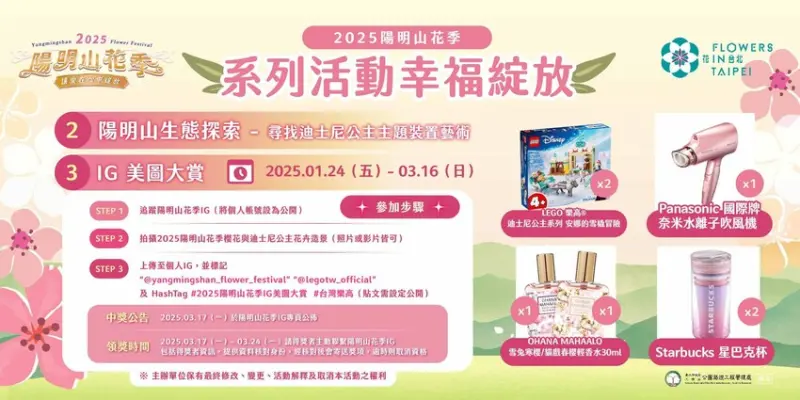 - 上傳個人IG並標記 #2025陽明山花季IG美圖大賞 #台灣樂高(貼文須設定公開)