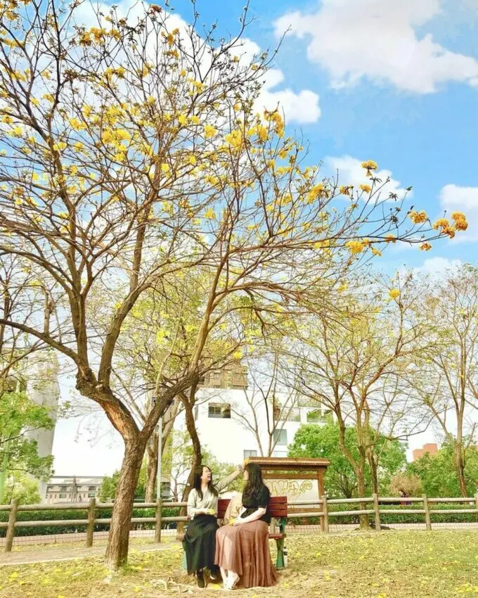 每年三月,台中大坑廍子公園就會迎來黃金浪潮!廍子公園位於北屯景賢路與廍子路口,佔地約5公頃,是北屯區面積最大的公園。公園內植滿黃金風鈴木,每逢花季盛開時,沿著公園地散步道就能沉浸在黃金雨中,因此獲得黃金公園的美譽。