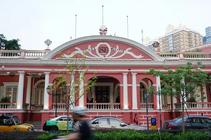 重建後的「澳門陸軍俱樂部 Macau Military Club Restaurant」,粉紅色的外牆,十分吸睛,建築外觀和澳門眾多的世界文化遺產建築都滿類似的