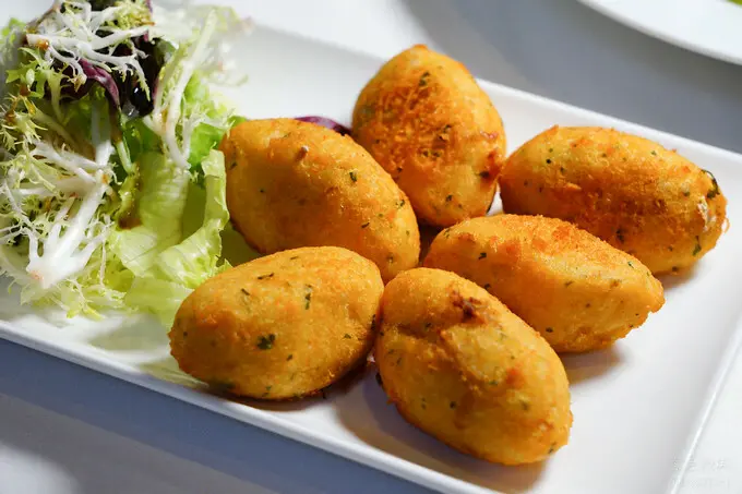 葡萄牙菜一定都有馬介休魚,其實馬介休魚,就將鱈魚用鹽巴醃製而成。是相當特別的一種葡萄牙食材。這道用馬介休魚絲與薯泥,洋蔥,香菜等混合之後,捏成橢圓球型下鍋油炸,是非常有名的小食哦