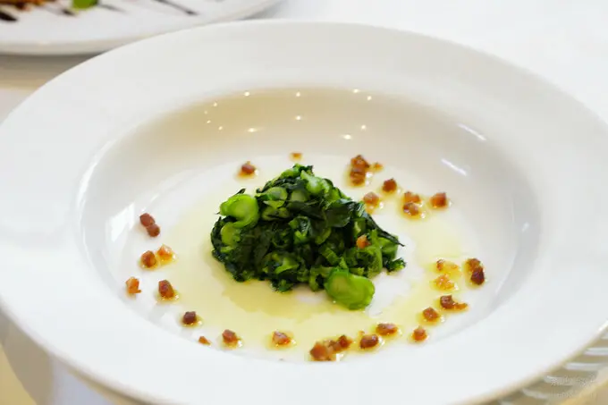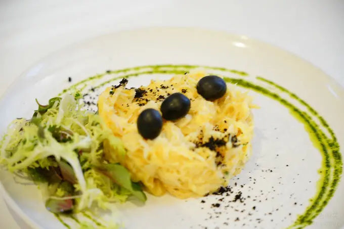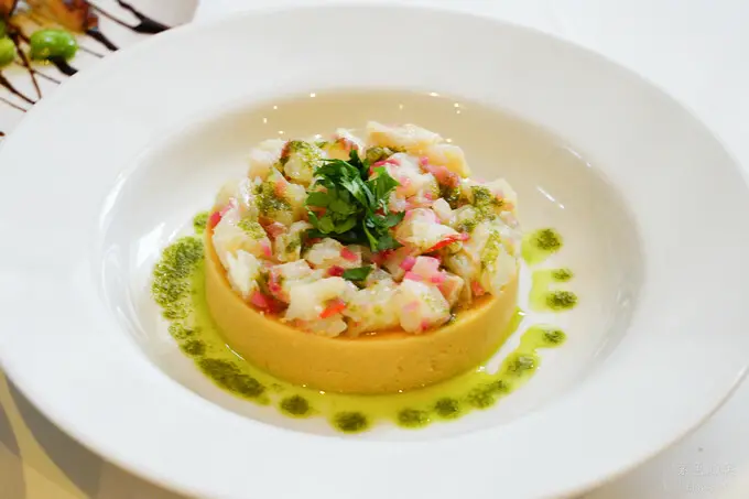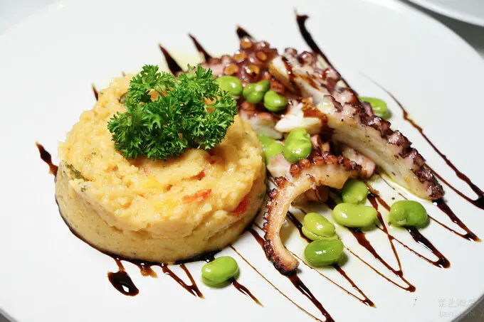 八爪魚伴粟米包碎,蠶豆和洋蔥磨成豆泥等,淋上橄欖油與油醋醬汁,一旁再搭配八爪魚