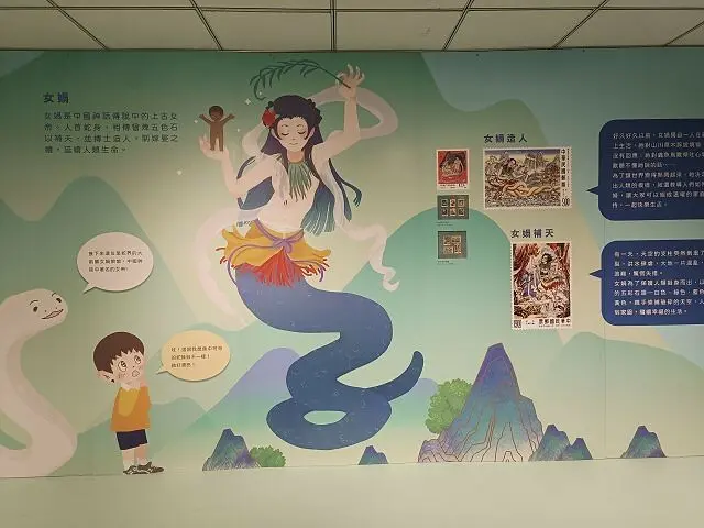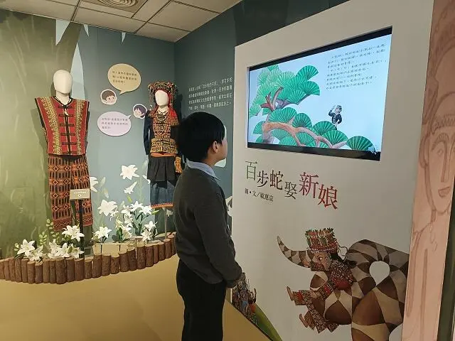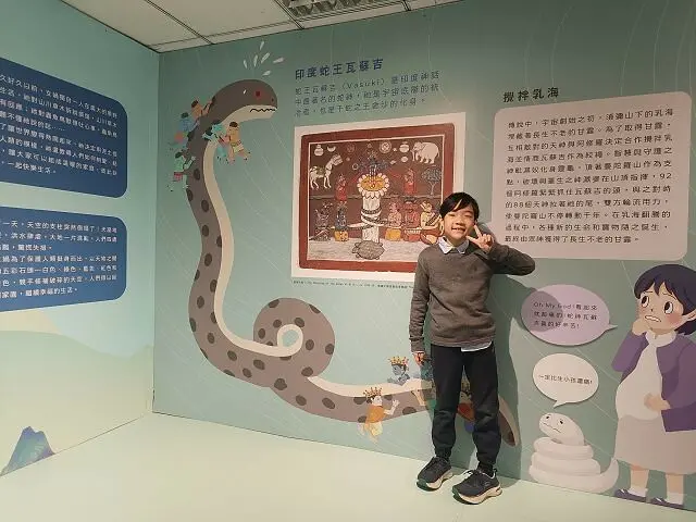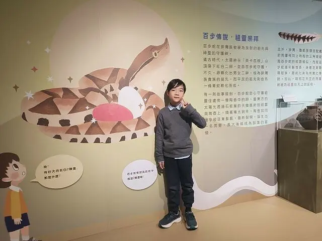 這一區介紹有關蛇的傳說,像是女媧的人首蛇身、排灣族的百步蛇傳說。這裡還有播放百步蛇娶新娘的繪本動畫,佐佐看得很專心。