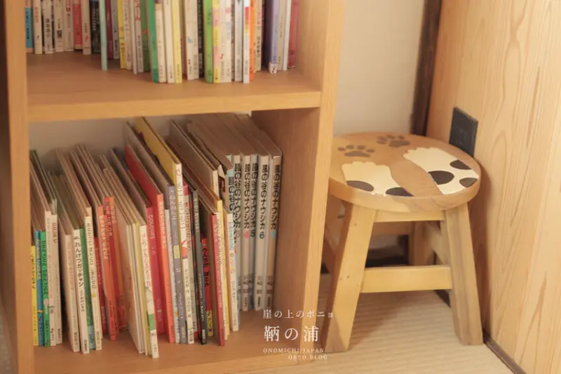 ▲角落還有貓咪小凳子,跟放滿日本書籍的書櫃
