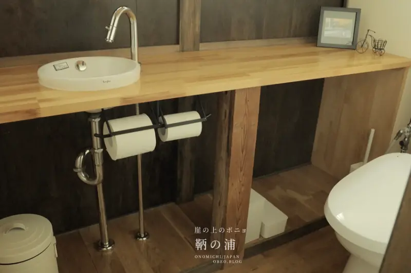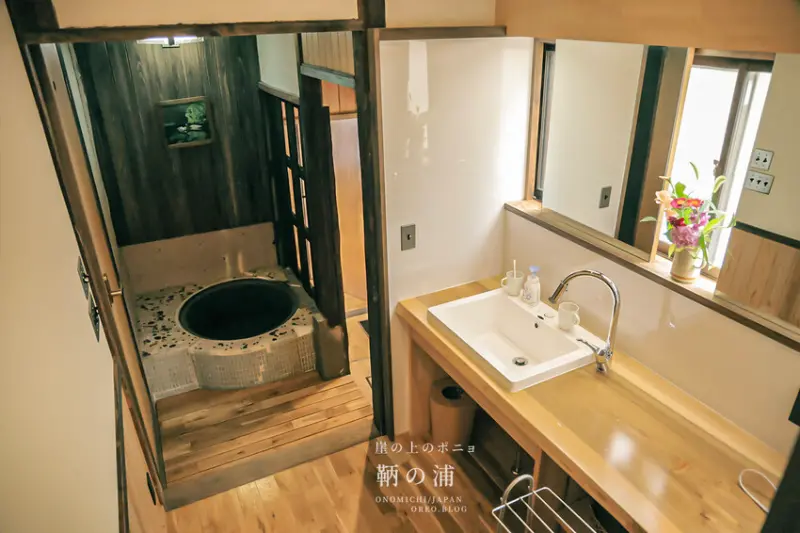 ▲衛浴要往下走幾階,洗漱台好寬敞,還有一個以前留下來的浴室遺跡,現在是沒有用處的,但屋主特地留了下來。