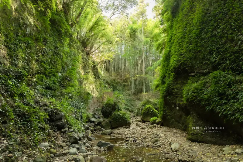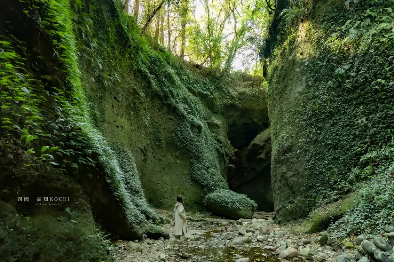 搭乘土佐黑潮鐵道後,我們在伊尾木站下車,走路到伊尾木洞只要5分鐘不到,但是卻彷彿到了一個室外桃源,洞口明明都還有汽車行經的吵雜聲,進去後就完全像是進入了一個秘密基地,聽不到現在都市的聲音,還很像是誤入了宮崎駿的動畫場景中,很難相信離車站這麼近的地方,不用像屋久島爬那麼久,就可以有類似的場景,太厲害了!