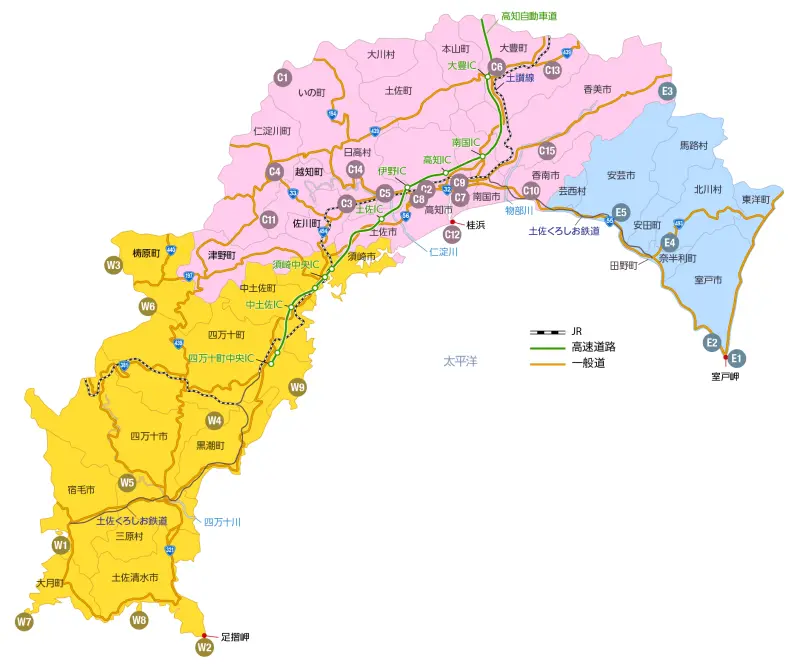 大家可以看下面這張照片,高知有分成東部、中部、西部三個大區域,今天要分享的是藍色那塊東部區域,東部地形上都是高山居多,從海岸邊就可以看到旁邊就是高聳的山脈,山上風景也很好!從高知市區就可以搭乘海岸線列車慢慢欣賞這片風景喔!