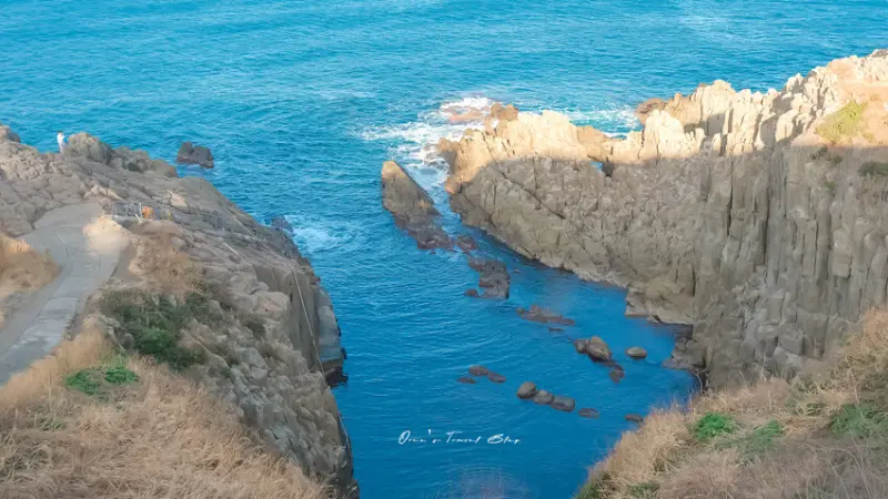 東尋坊是越前加賀海岸國立公園的國家天然紀念物,是約1300萬年前岩漿噴發到地表附近,在冷卻凝固的過程中,形成了五角形或六角形的柱狀。後來經由地殼變動,岩石才出現在地表,海岸線延伸約1公里,附近也有紀念品土產店、和一些海鮮餐廳,從蘆原溫泉過來的話沿途會經過越前松島水族館