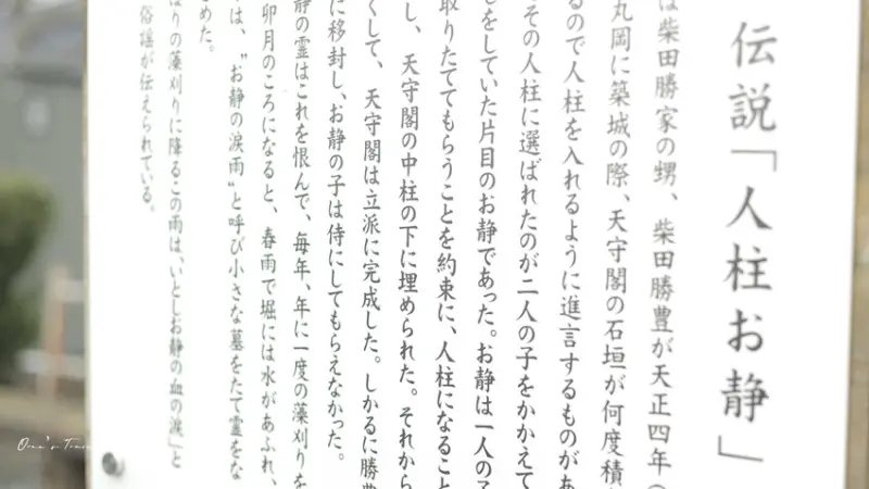▲慰靈碑上寫著一段可怕又難過的傳說,在1576年建造丸岡城時,據說無論如何石牆都會坍塌,工程一直毫無進展,當時就有家臣建言要打生樁,也就是在底下活埋一個人,白羽之箭選中了寡婦阿靜,阿靜獨自帶著兩個孩子,生活困難,當時成為人柱的條件就是讓她的其中一名兒子當上武士,阿靜也被活埋在丸岡城底下,工程順利結束了。