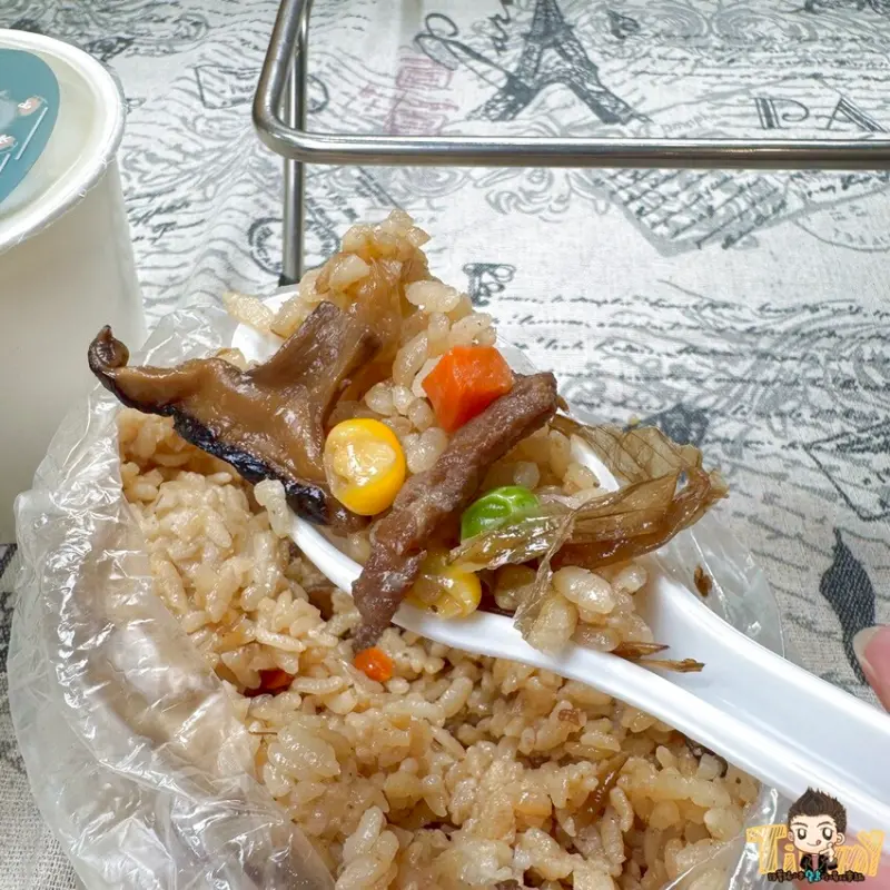 配料有三色豆、香菇、肉絲,以鹹香醬油、油蔥酥調味,再點一杯飲料不用50元就可以吃飽喔