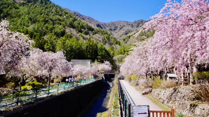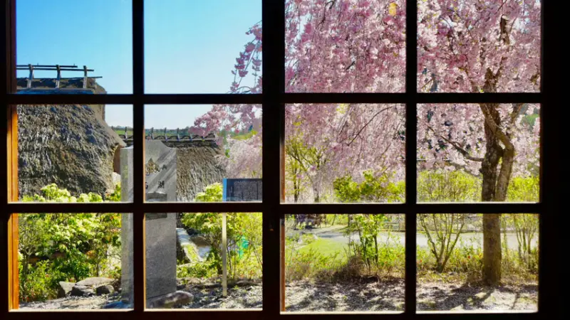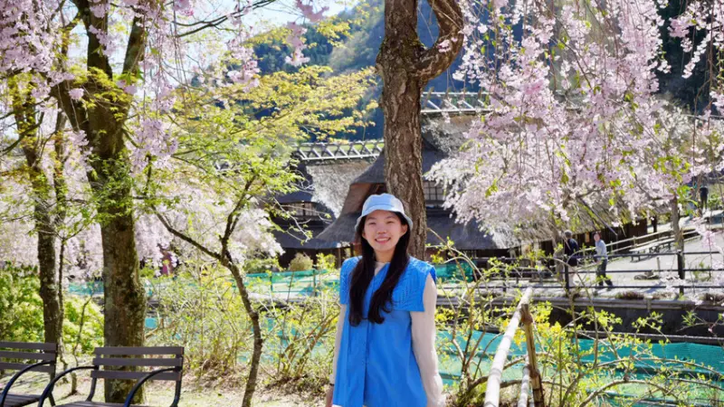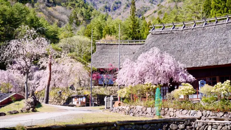粉色枝垂櫻花綻放真的很美,這裡是山梨縣的合掌村,春天可以拍到合掌村和櫻花的美景,曾被譽為「全日本最美麗的合掌造村落」🏠!