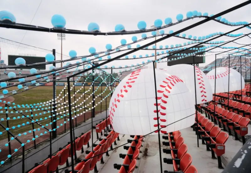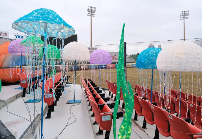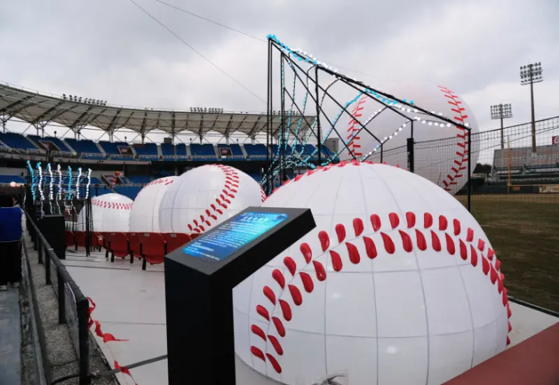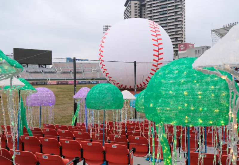 巨型棒球與水母燈共舞?很特別的組合,此區以棒球、海洋為主題,整排的水母燈好像看棒球的觀眾們在熱情舞動加油的樣子。