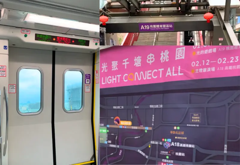 桃園2025燈會主場就在A18高鐵桃園站,對外縣市朋友們來說,高鐵應該是最方便的選項,A18逛完也可以再搭接駁車或捷運到A19桃園體育園區站去拍寶可夢!推薦開車的朋友們一個免費停車的好消息,我們這次是停在捷運A20附近的興南停車場,周末停整天竟然完全免費!(2月7日~23日停車場營運時間:星期一至四為下午1點至晚上11點,2月12日開燈日及星期五至星期日為上午9點至凌晨12點。桃園機捷A16橫山站也有開放免費停車喔)雖然停車場蠻大的,但人潮很多,建議下午3點前會比較有位子。還有周末捷運真的塞爆了很可怕!我們是平日去燈會的,人潮相較之下少很多,如果可以盡量還是平日去觀賞體驗較好,另外跟大家分享,如果你不幸遇到捷運爆滿的狀況,建議走到周邊桃園IKEA附近會比較好叫車(Uber比較快)