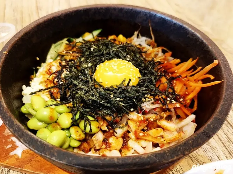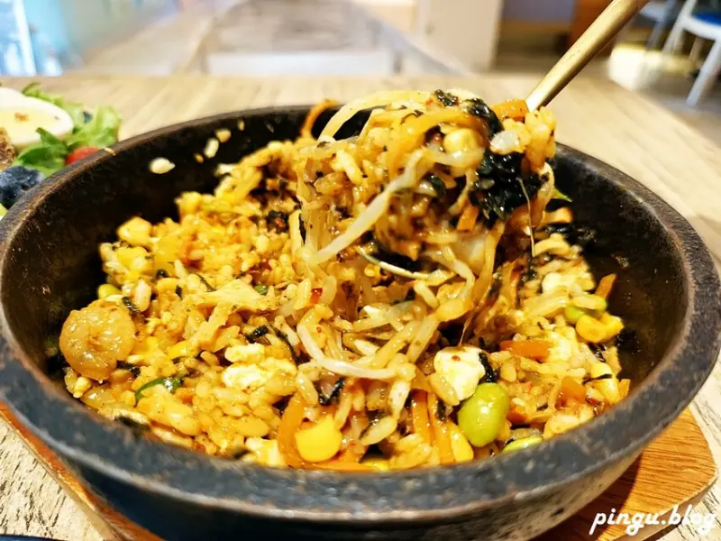 石鍋拌飯最誘人的就是脆口的鍋巴,豐富的配料及白飯、醬汁一起均勻攪拌,加入微辣的韓式泡菜,每一口都吃得到彭湃的食材,超下飯~