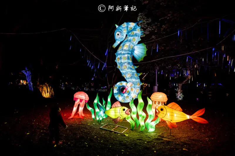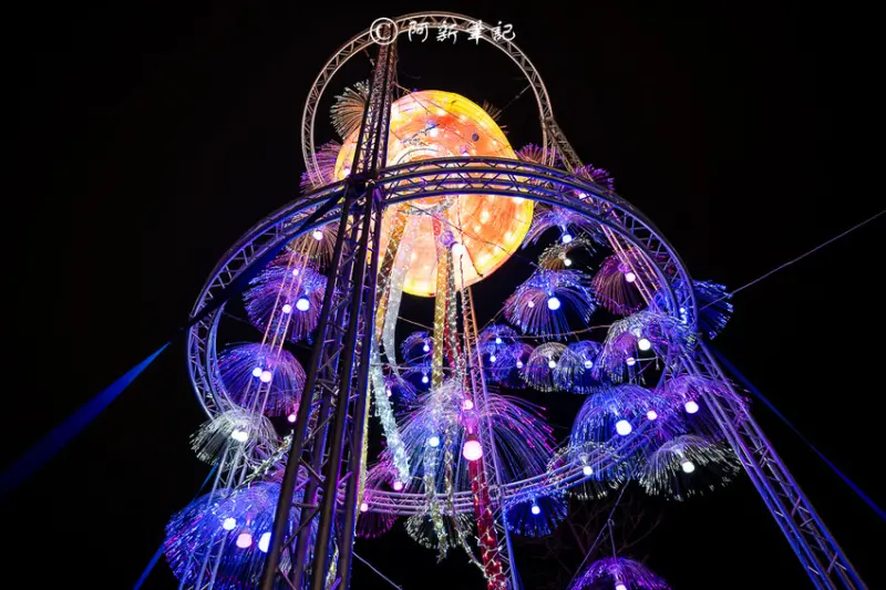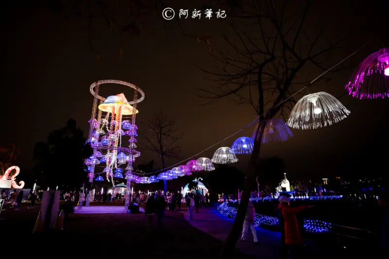 視線沿著水母燈看去,一整個哇!的驚豔感,是超級超級超級大水母!太好拍了,今年2025中台灣元宵燈會農業局海洋奇幻冒險燈區好可怕!真的是記憶卡殺手無誤~