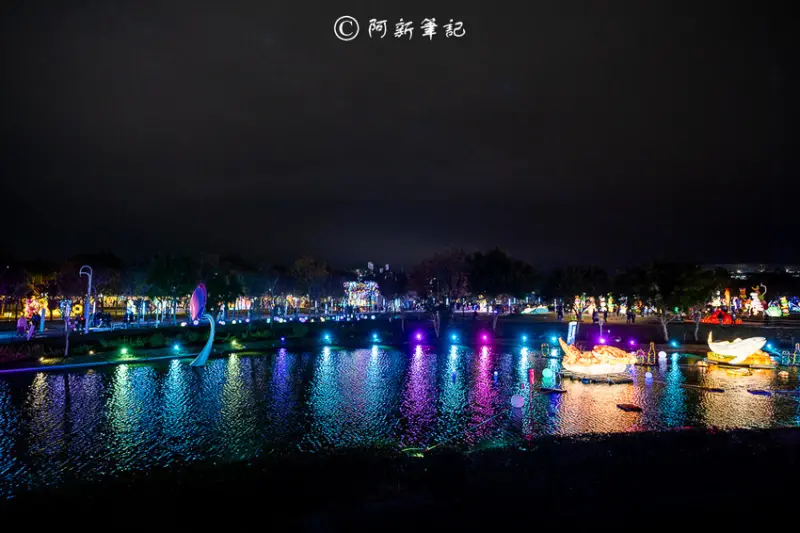 沿著水岸步道一直走,今年《2025中台灣元宵燈會》的燈光布置真的很棒,不只陸地燈組精彩,水面的燈組也超級棒,晚上7點半後來,真的太夢幻太精彩了。