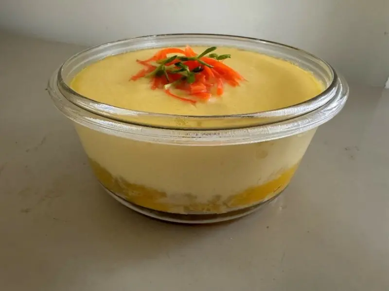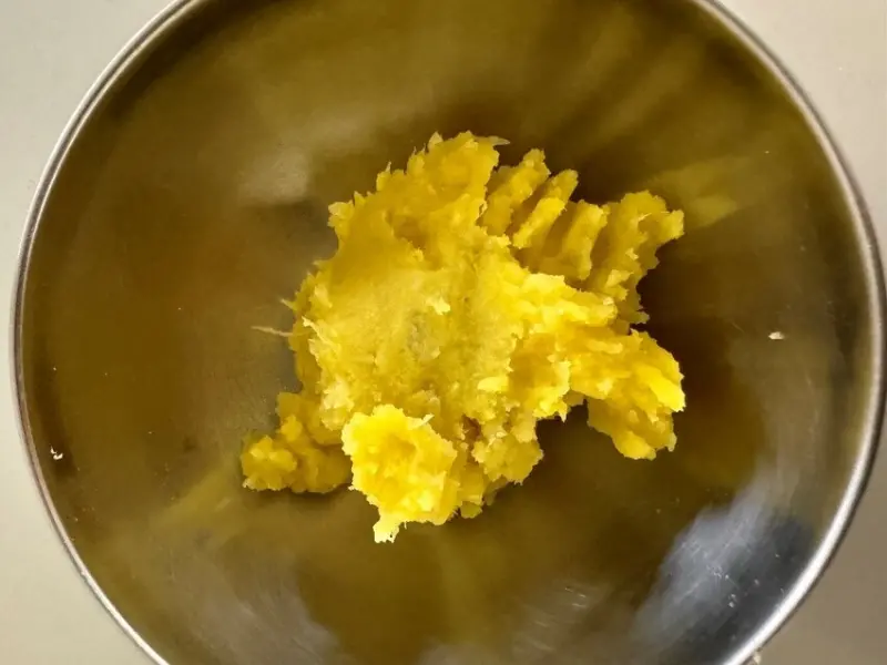 步驟2:因為瓜瓜園的地瓜是已經清洗過的,所以可以直接去皮後壓成泥狀,放入碗中當基底,再將加水後的蛋液倒入,最後放胡蘿蔔絲。