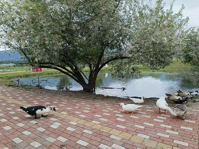 鴨鵝在池中戲水一會兒,就一起上岸悠閒散步,整個畫面好療癒。