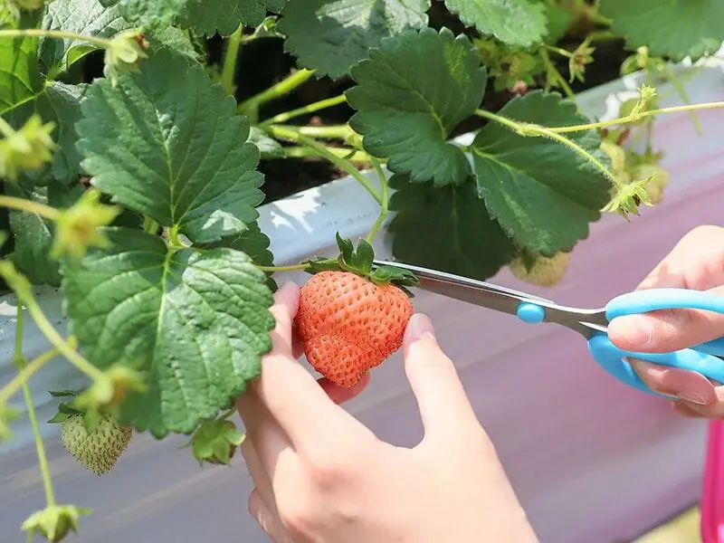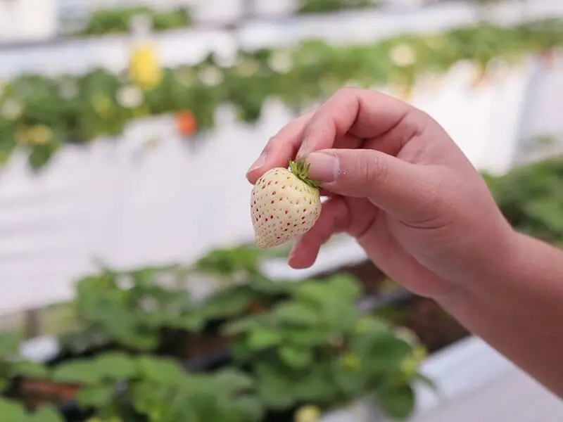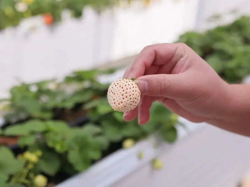 白草莓的成熟標準跟紅草莓不一樣,它的籽點周圍會帶點紅色,差不多那個大小就是最好吃的時機!剪下來聞一下,會有獨特的香草奶油香,是草莓界的夢幻逸品耶。