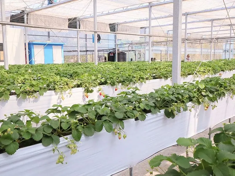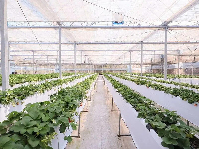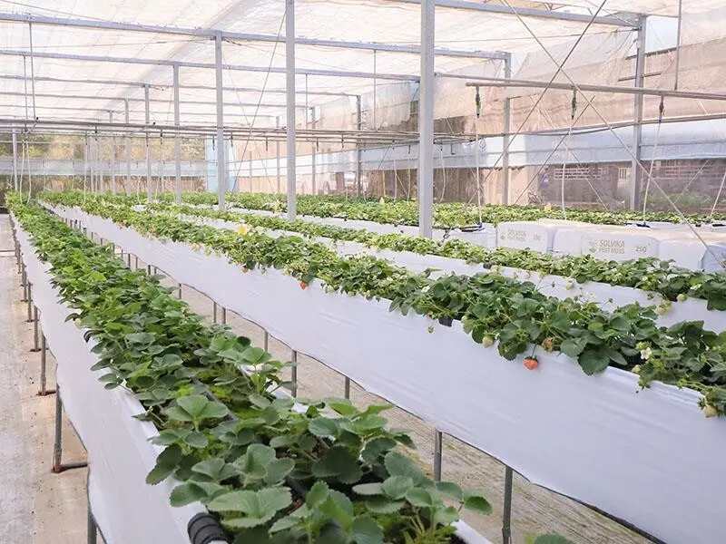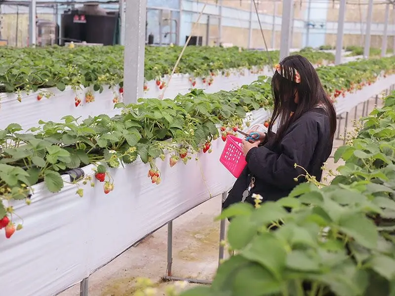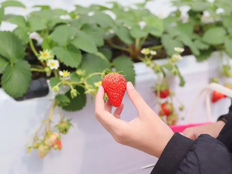 真的很難想像,這裡居然有個這麼棒的草莓園!超大的溫室把草莓照顧得超好,整齊的高架草莓架,每一株看起來都生氣勃勃,葉子綠油油的,果實飽滿飽滿的。