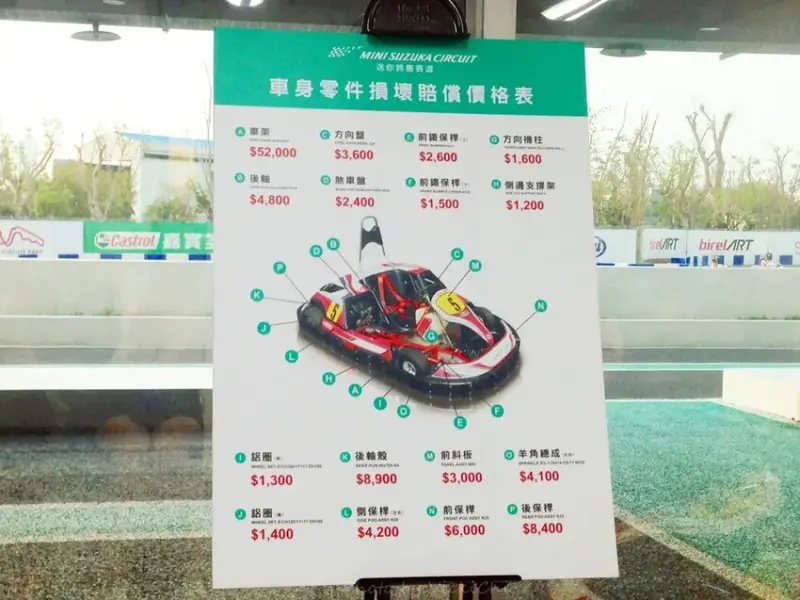 看到Birel N35卡丁車的真面目,小小的好可愛,待會就要坐上車,在賽道上好好地繞個幾圈,光想就覺得超嗨的,看到旁邊有一個板子,上面列出車子受損的賠錢價目表,真的是賠錢事小丟臉事大啊。![]()