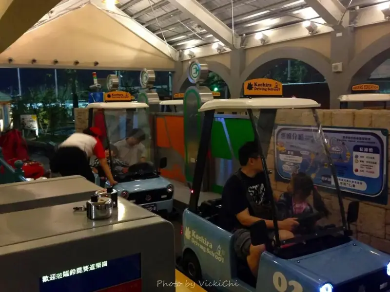 這個主要是讓小朋友體驗開車的,他們可以在有各種交通號誌的路線上學習交通規則跟行車禮儀,完成任務還可以拿到駕照喔,如果是大人來玩,一個人一台車可能會有點擠,兩個大人一台車就會非常非常壅擠。