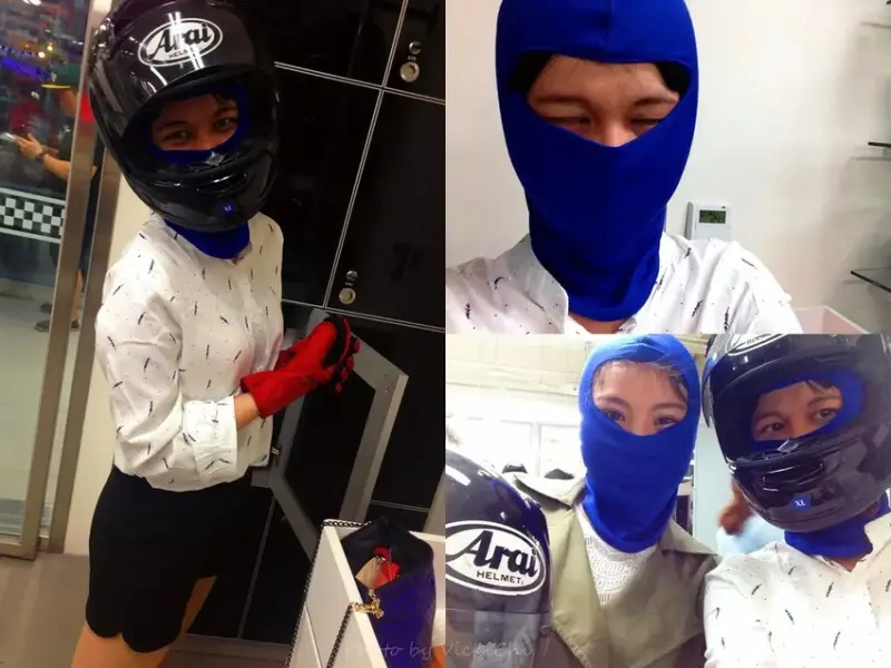 上完講習課程之後,就等報到時間到再進去裝備室穿戴裝備準備上場,第一次戴這麼專業的安全帽、頭套、手套,感覺超級新奇的,上場前,還會從螢幕上看到自己的名字跟號碼,等等上場就直接找自己號碼的車子,還好我對應的號碼車子不是在最前面,鬆了一口氣。