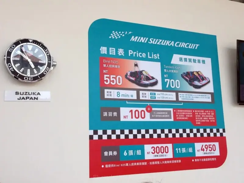 我們直接到櫃檯安排場次,卡丁車有一人一台跟兩人一台的兩種選擇,最後我們決定一人開一台卡丁車,這邊寫的是2017年的價格,大家要注意一下,2025年已經調漲為一人一台卡丁車750元(含講習費)、兩人一台則是950元(含講習費)喔。