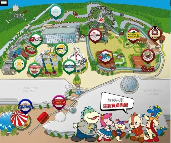 樂園、迷你鈴鹿賽道營業時間:週一至週日上午11點~晚上8:30 (每日最後售票時間為閉園前30分鐘)
