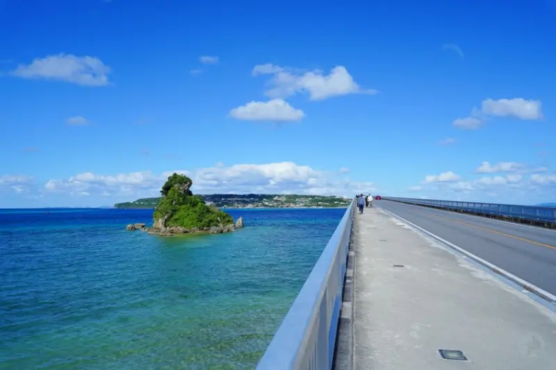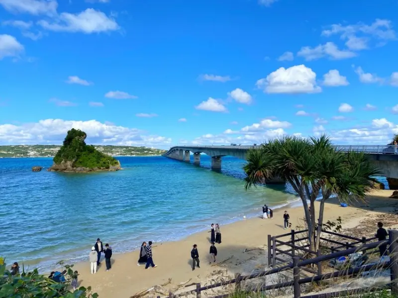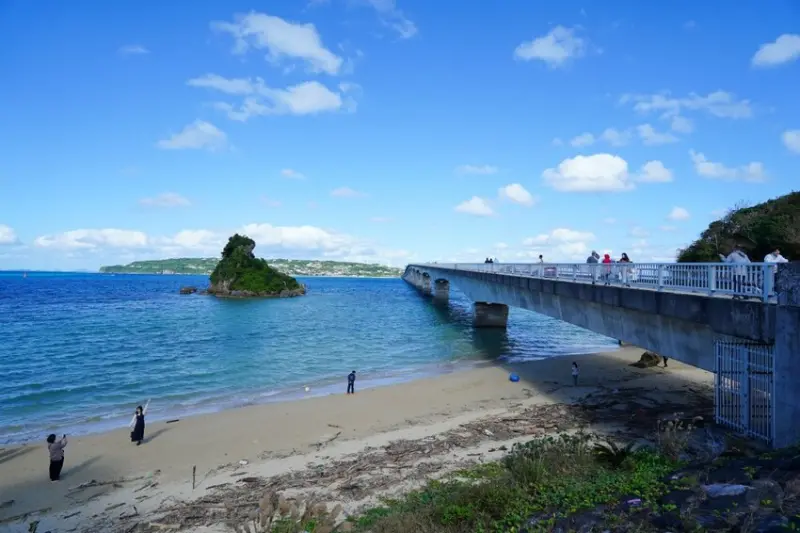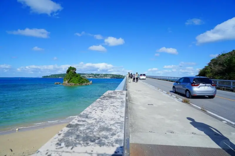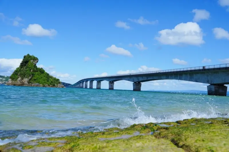 古宇利大橋位於日本沖繩縣北部的今歸仁村,連接沖繩本島與古宇利島,全長1,960公尺,於2005年啟用。橋樑採無橋墩設計,與蔚藍海景相映成趣,被譽為「海上公路」。古宇利島有「戀人之島」美稱,擁有純淨海灘和著名的心形岩等景點,是熱門觀光勝地,適合自駕前往,距那霸市區約1.5小時車程。