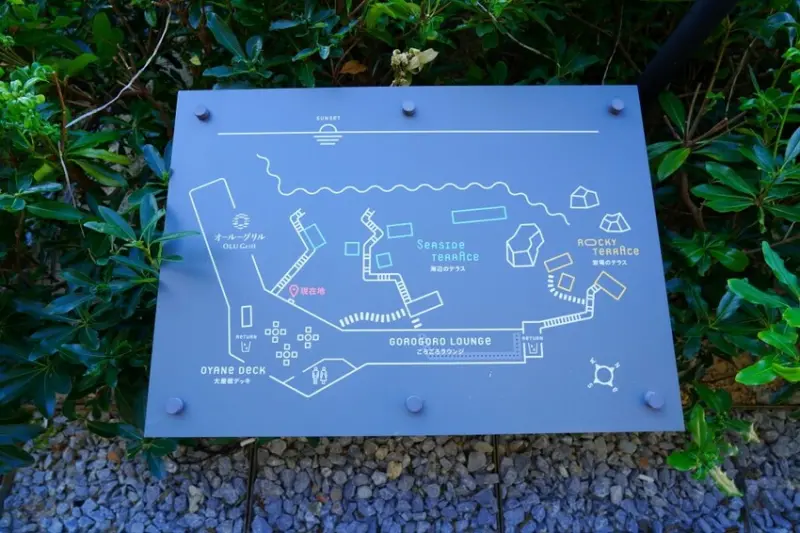 這裡有一個指示牌,整個空間其實不算太大,但每個角落都超級好拍,難怪大家都特地來這裡取景!這裡的設施也很豐富,BANTA CAFE劃分為OYANE DECK(屋頂露台)、GOROGORO LOUNGE(室内休息區)、ROCKY TERRACE(岩石露台),還有 SEASIDE TERRACE(海邊露台),每個區域各有特色,超適合慢慢逛、邊拍邊享受海景的悠閒氛圍~