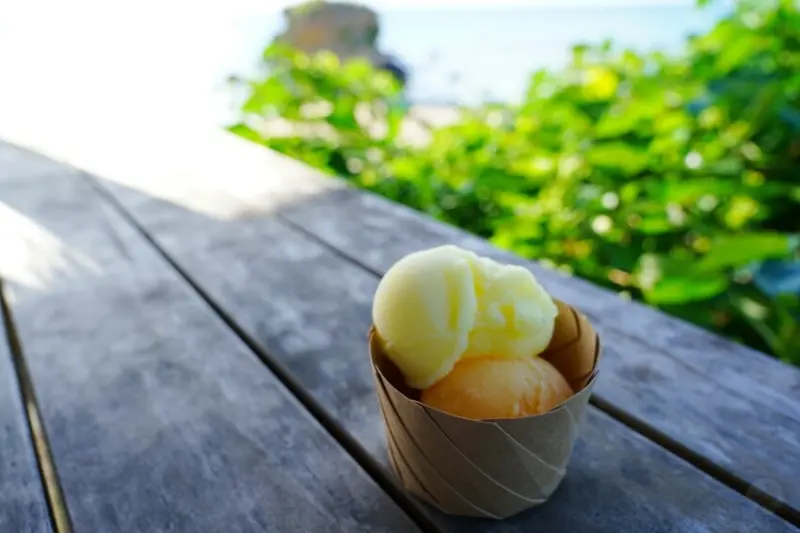 來日本沖繩當然要吃冰啊!我點的是 芒果 和 沖繩香檬 口味,酸酸甜甜的超清爽~而且還可以搭配 紅芋 或 苦瓜 等特色脆片當配料,不只口感豐富,還充滿沖繩風味,真的超特別又好吃!推薦一定要試試看!