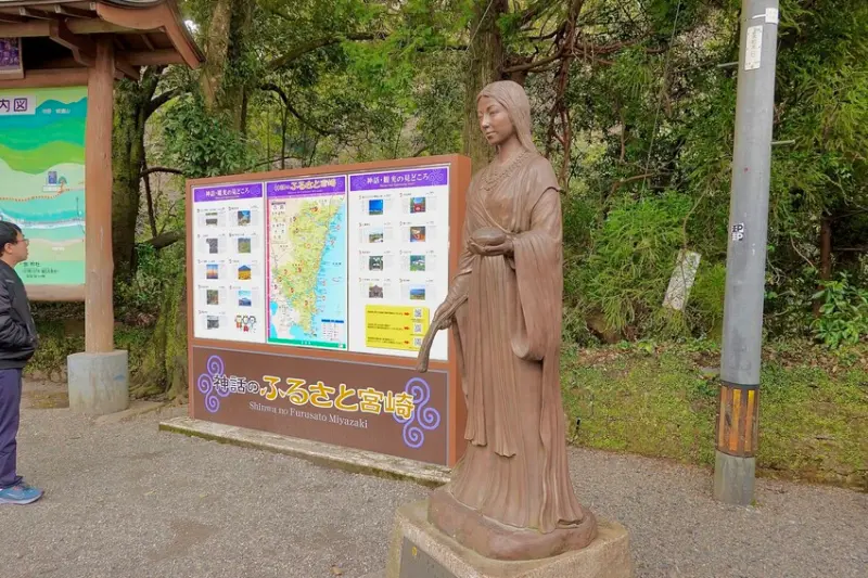 天照大神雕像,就在前往西宮的參道上會看見,這位女神非常有個性,很會鬧脾氣,相傳她只要心情不好便會躲進洞窟裡不出來,世界會陷入一片黑暗,所以800萬尊神明為了引她出來,於是才有各種神樂樂曲舞蹈,不過也有其他說法,就看大家自己喜歡哪種版本就是。