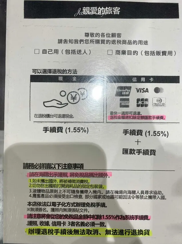 如果要退稅,百貨公司會收取1.55%的手續費喔