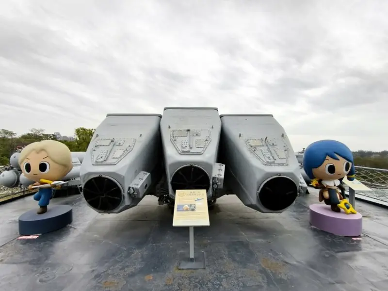 ▼三聯裝雄風一型飛彈也超酷,是以色列的天使飛彈二型為範本,逆向工程開發出來的一款武器,在民國七十年代是台灣主要的反艦武器,直到雄風二型出現後,才在民國101年正式全數除役~旁邊多了仙境傳說的角色讓威風凜凜的飛彈頓時變得溫柔起來了!