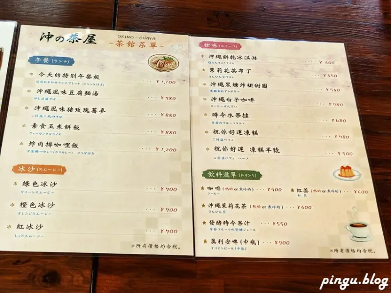 沖繩沖の茶屋有中文菜單,以主餐、冰沙、甜點及飲品為主,每一道餐點都精心準備,保證新鮮且富有沖繩特色