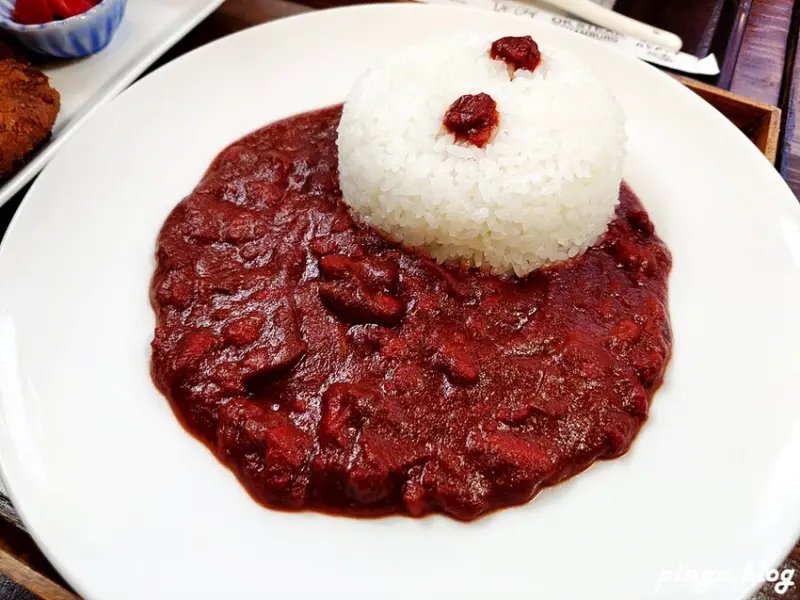咖哩以番茄醬汁為基底,煮出暗紅色的咖哩,看著挺有食慾的!!