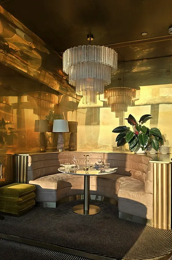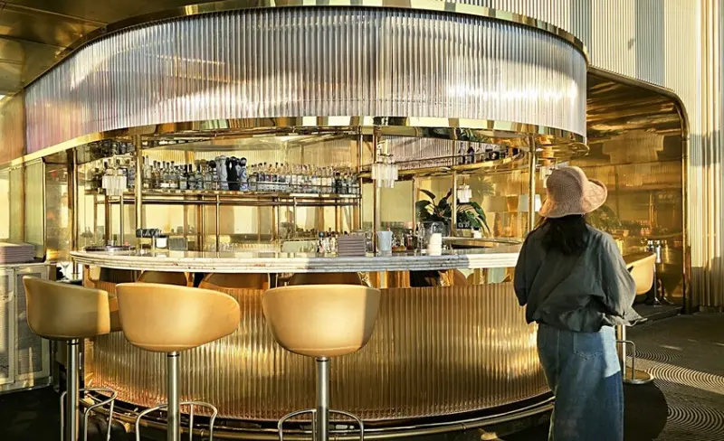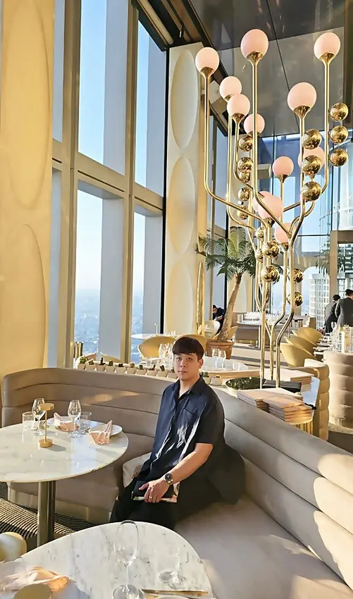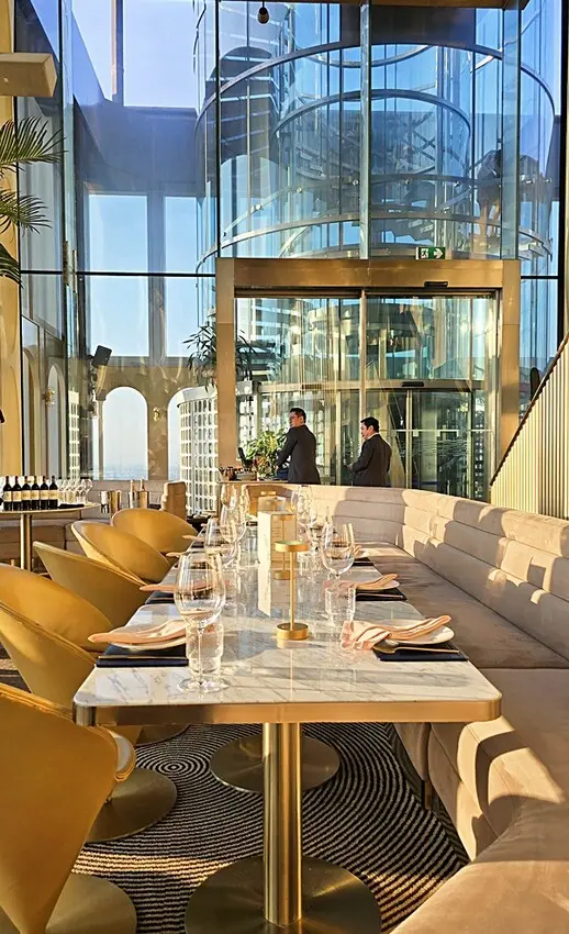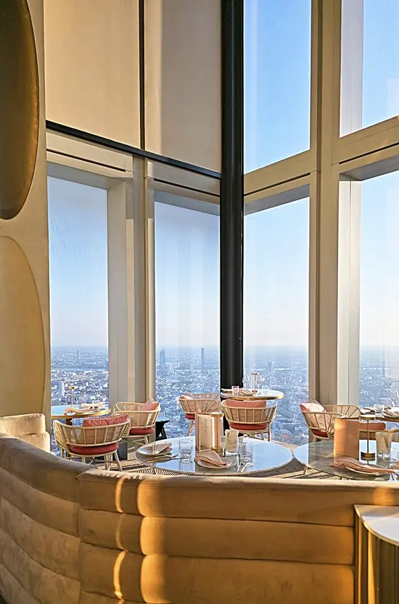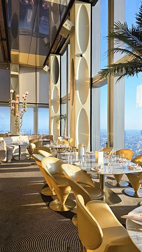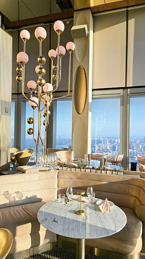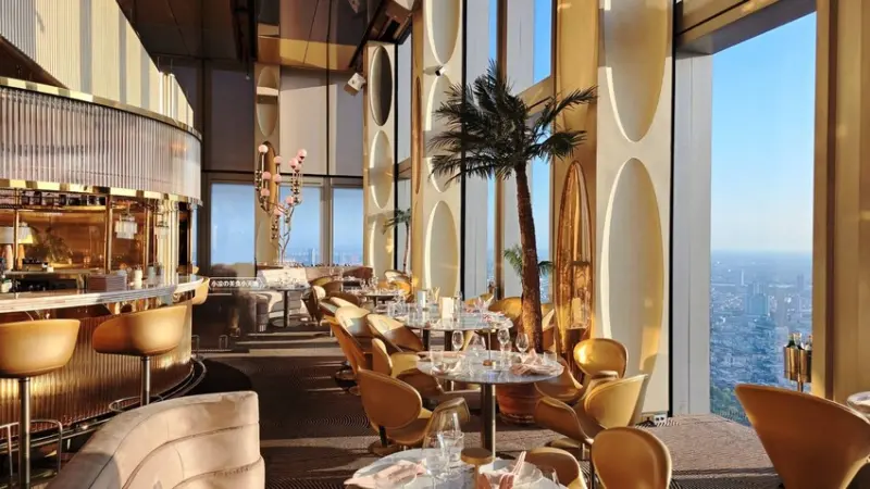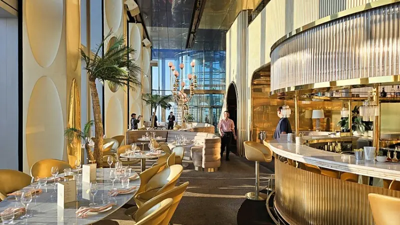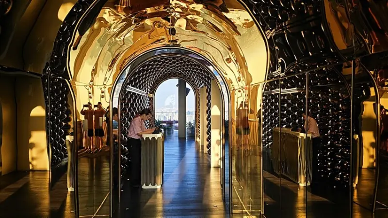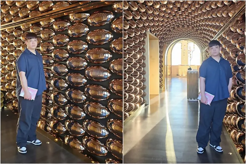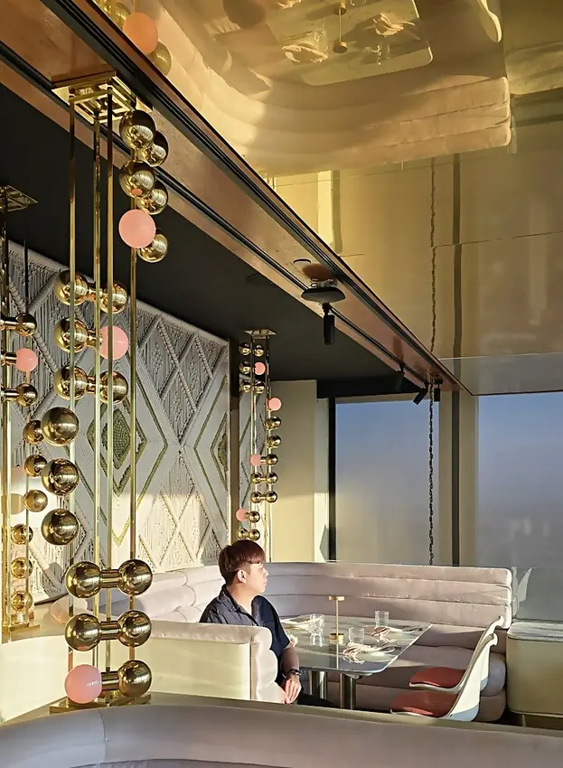 我們是訂傍晚五點半的時間,所以搭著快速電梯直達76樓!!門一開的瞬間,就被那點綴金銅的鏡面隧道給震撼到,這裡也太美了,宛如把寶石都鑲在牆面上,營造出一種視覺上的盛宴!!