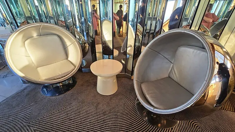 這裡通往二樓洗手間的門口前,設立的沙發座位區,是不是很特別都是鏡面設計,一整個超華麗!!S出來還告知男生廁所是玻璃窗可以看到外面景色,但76樓往外看出還真的有點小可怕XD