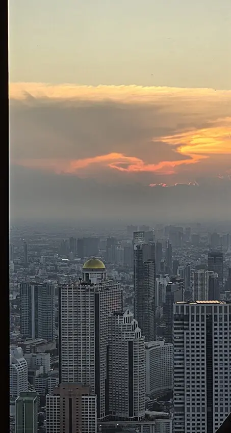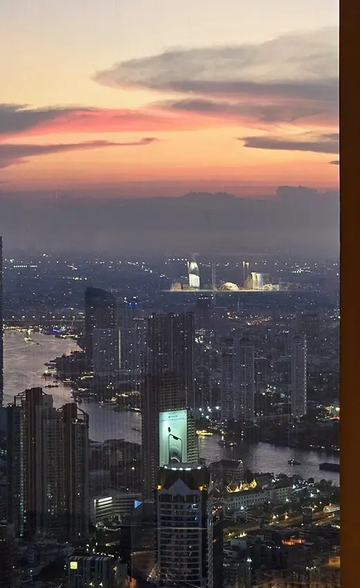 隨著逐漸變暗的天色,天空也露出不一樣的調色盤,都市間的燈光也漸漸亮起,當下的美,一定要由你自身來感受囉!Ojo Bangkok官方網站預約