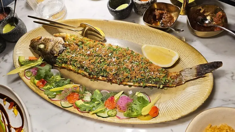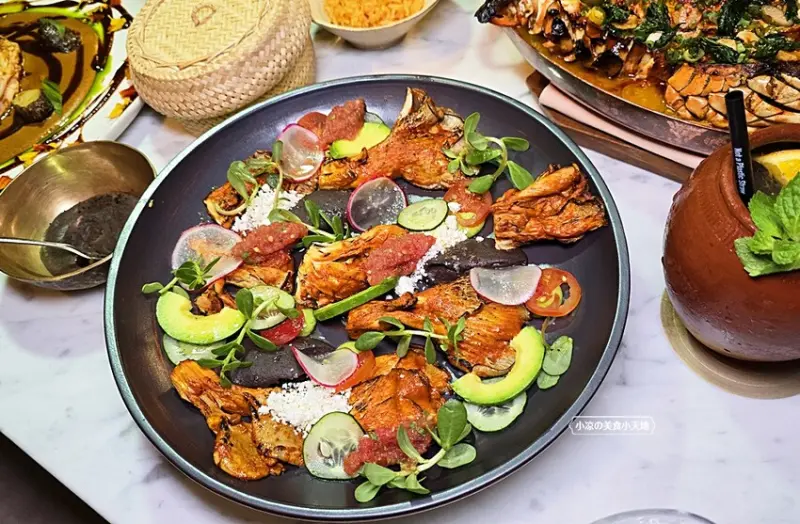 這一道烤魚料理很有墨西哥的特色,整尾烤魚的上頭鋪滿了酥鬆以及細蔥末增添了香氣與口感,來搭上魚肉的鮮嫩,建議要吃時先將一旁的檸檬擠入,味道會更讚!!