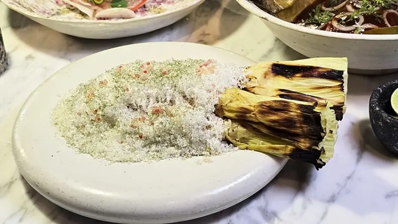 這一道「Esquites」是改良自墨西哥街頭常見的玉米小吃,主廚先將玉米筍烤過,刷上特製蛋黃醬、刨上極細起司,風味清甜、深得大家喜愛!