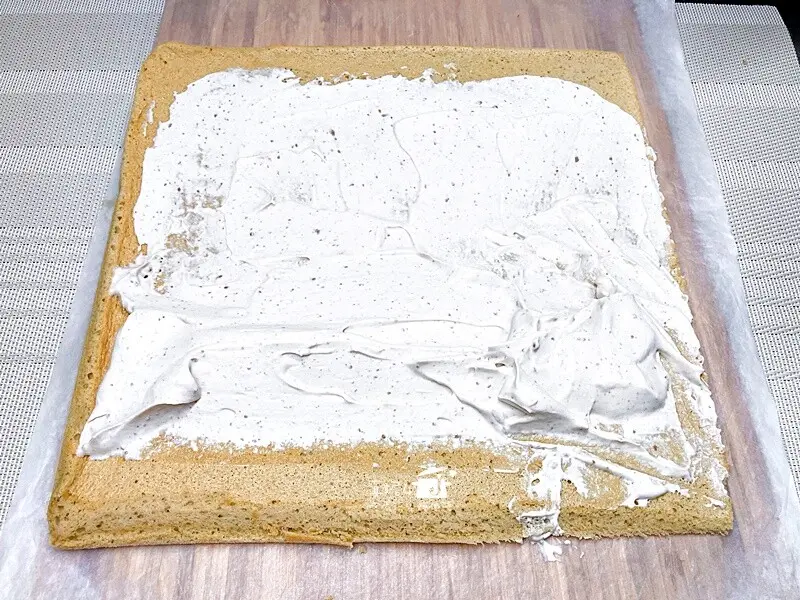 奶油霜集中堆抹在蛋糕的1/3處(起端留3公分不抹),再往尾端薄薄的推抹一層(尾端留5公分不抹)