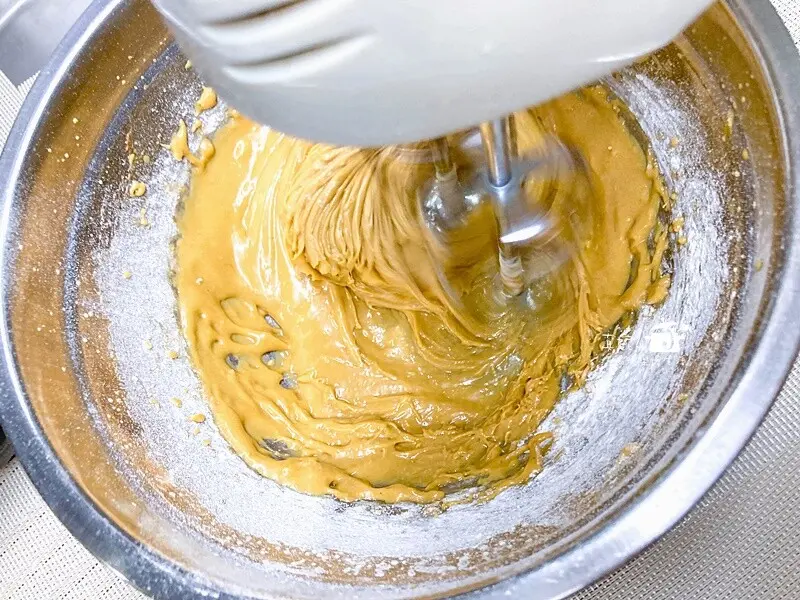 2.加沙拉油用電動攪拌器打拌到出現均勻的紋路,加咖啡抹醬拌勻,篩入低筋麵粉繼續混拌到沒有白色的粉粒