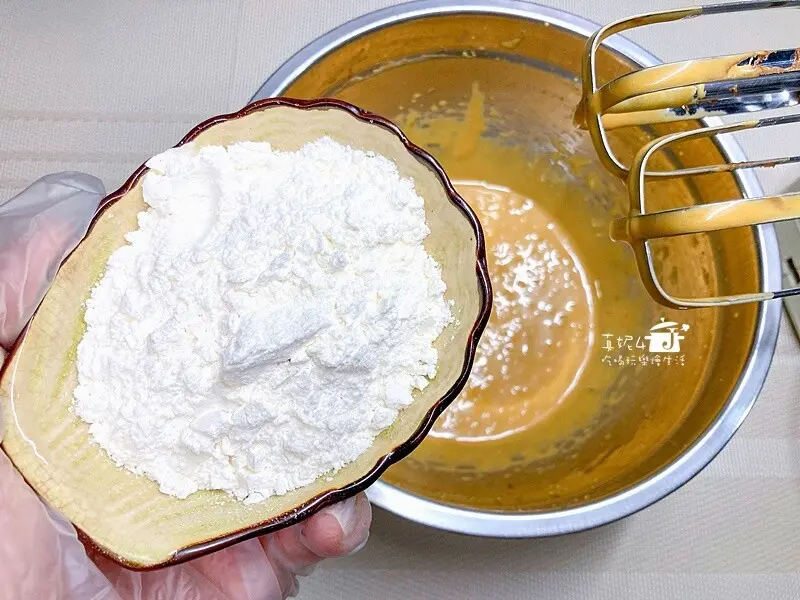 1.糖粉20g和3顆蛋黃,用電動攪拌器打到質地粘稠