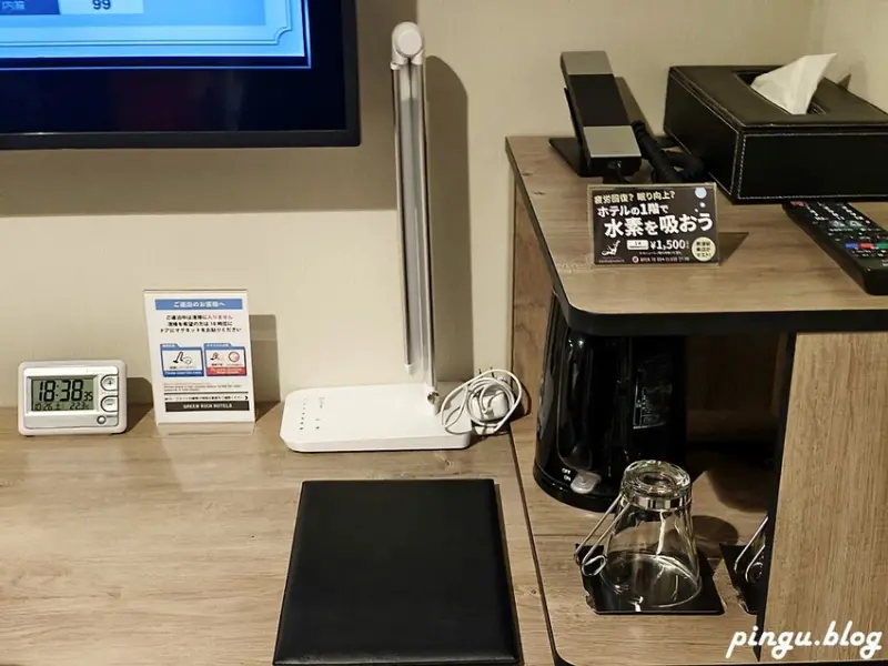 桌上備有茶杯,熱水壺、檯燈及鬧鐘~