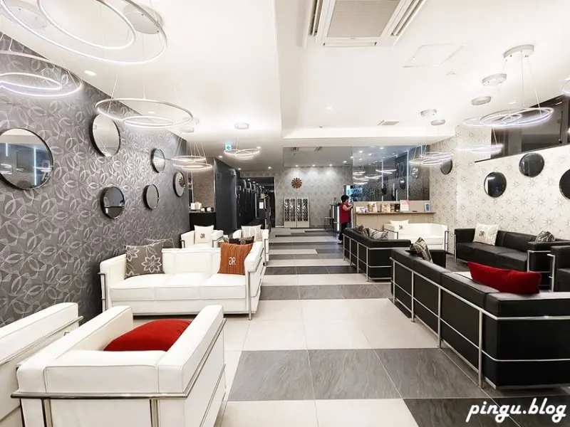 一區黑一區白的沙發椅讓休息區展現時尚風,圓形鏡子及線條的燈管也都帶著普普簡約風,整體來說相當的現代感~