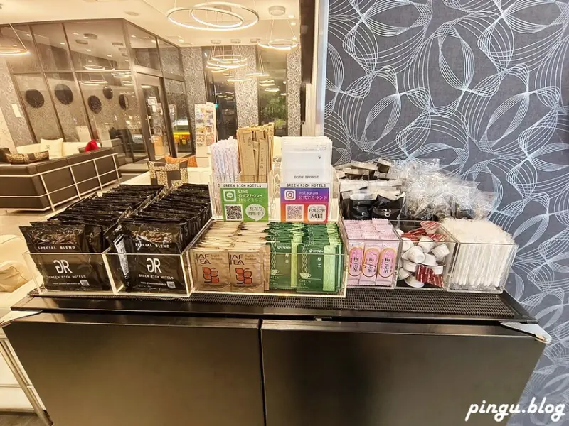 米子站前人工溫泉二股湯之華格林里奇飯店Green Rich Hotel備有茶包、咖啡包及梳子/刮鬍刀等,若有需求可以在大廳索取~