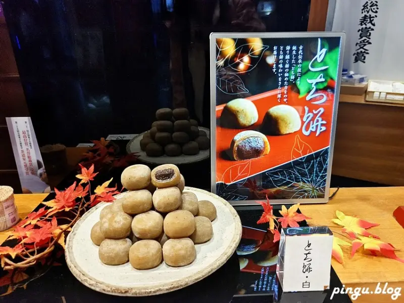 另外也有獨特的栃餅,七葉樹以秘製方法去除苦味,然後與糯米一起蒸熟,用杵搗碎,然後與當地種植的 Hoki Dainagon 紅豆製成的豆沙混合。 榮獲全國糕點展覽會名譽會長獎,是山陰最受歡迎的糕點之一~很值得大家前往購買