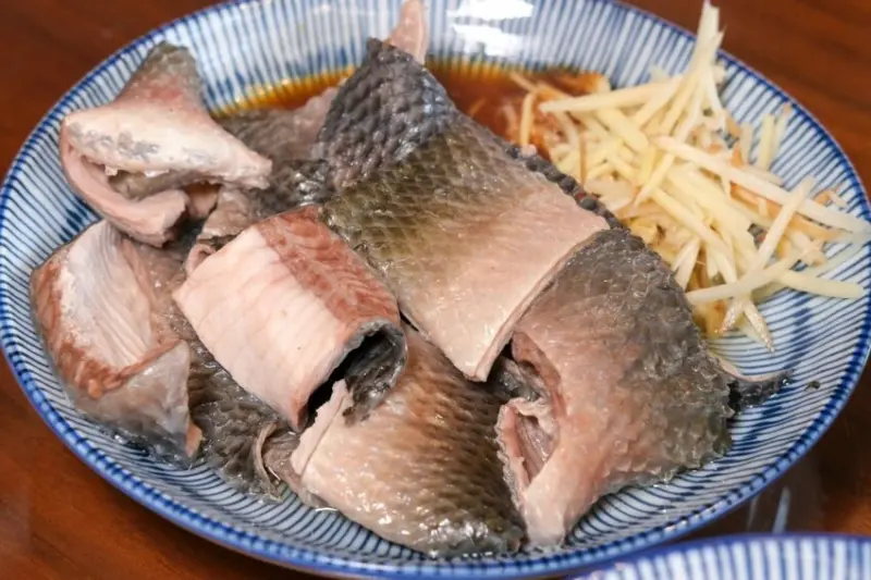 ▼Q到不行的川燙魚皮 ! 吃起來鮮味十足無腥味,沾點醬在尬上薑絲吃,最能感受新鮮食材的甜味!