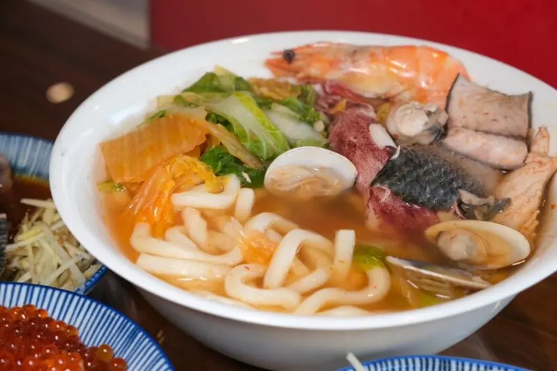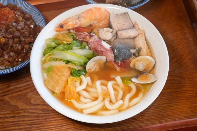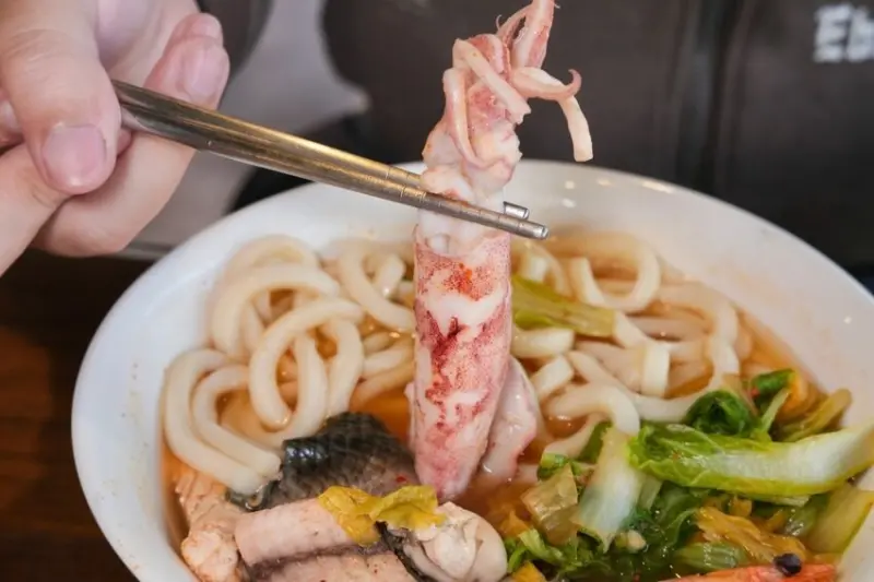 ▼讓人飽到天靈蓋的泡菜海產意麵,海鮮料超級豐富,可以吃到虱目魚皮、虱目魚、鮮蝦、蛤蠣和小卷,泡菜湯頭更是集結了海鮮鮮味,伴隨彈牙的讚岐烏龍麵太涮嘴!